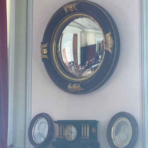 The two yellow and white seats along with the pier of mirror and the rosewood console table where bought in Paris in 1870. The mahogany secretary and the grandfather clock was during the Davis family time frame.